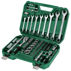 Klucze nasadowe i płasko-oczkowe zostały wykonane z trwałej stali CrV, co zapewnia ich wytrzymałość i długowieczność. Zestaw zawiera aż 82 elementy, w tym klucze nasadowe i płasko-oczkowe w różnych rozmiarach, adaptery, przedłużki oraz grzechotki.