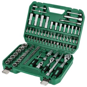 Klucze nasadowe i płasko-oczkowe zostały wykonane z wysokiej jakości stali CrV, co gwarantuje ich trwałość i odporność na uszkodzenia. Zestaw zawiera aż 94 elementy.