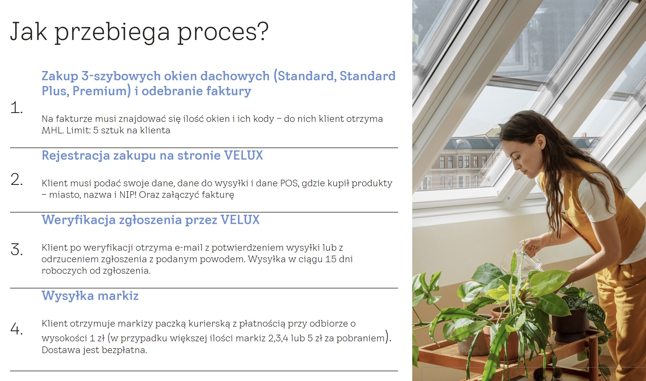 By uzyskać markizy za 1 zł należy dokonać zakupu okien dachowych Velux z grupy Standard, Standard PLUS lub Premium. Zakup ten musi zostać zarejestrowany na stronie Velux. Po rejestracji jest dokonywana weryfikacja zgłoszenia przez Velux a po zatwierdzeniu klient otrzymuje paczką kurierską markizy za 1 zł.
