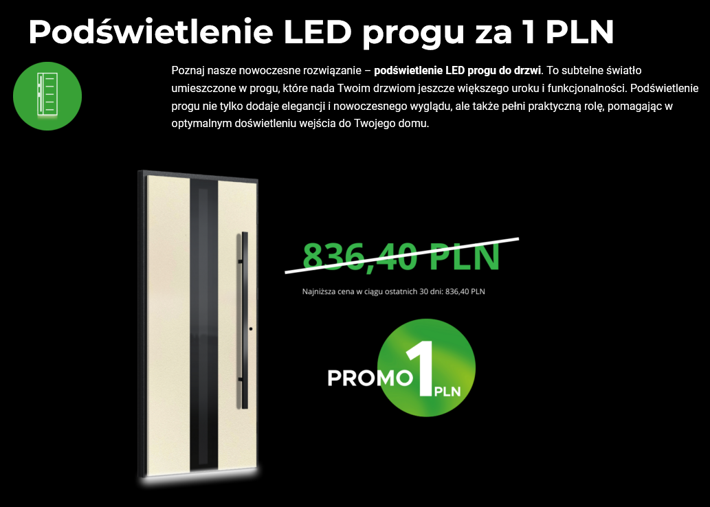 Ostatnią opcją promocyjną jest podświetlenie LED progu za symboliczną kwotę 1 zł. Podświetlenie LED umieszczone w progu drzwi dodaje elegancji i nowoczesnego wyglądu. Jednocześnie pełni ono praktyczną funkcję, optymalnie doświetlając wejście do domu i tworząc przyjemną atmosferę. To subtelne światło nadaje drzwiom dodatkowego uroku i wpływa na estetykę całego otoczenia.