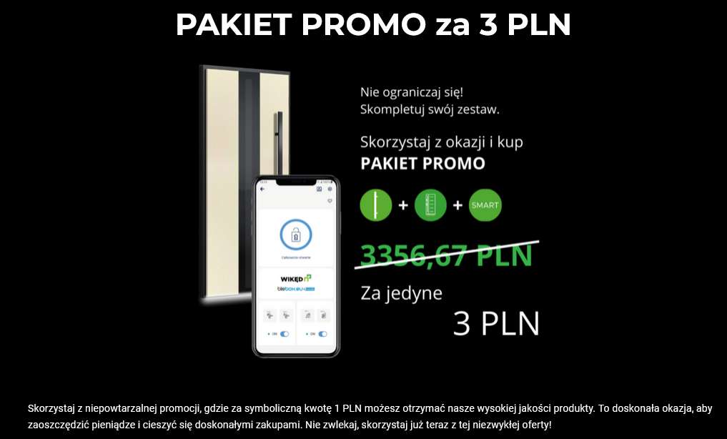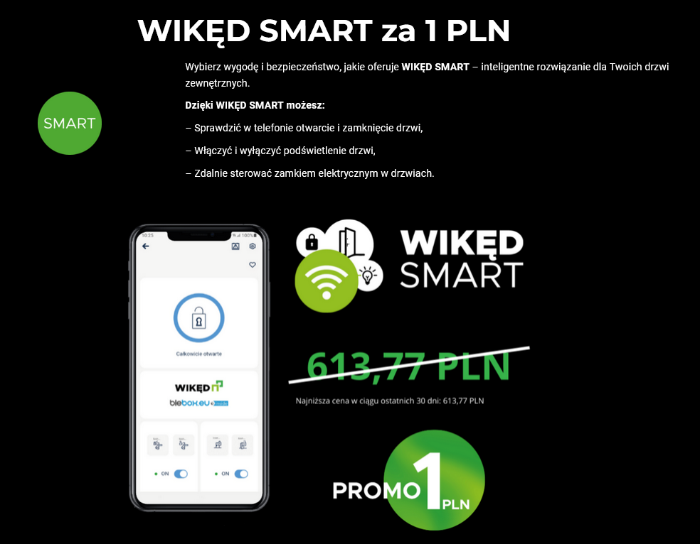 Kolejną opcją w ramach promocji jest dołączenie do zamówienia WIKĘD SMART za dodatkowe 1 zł. WIKĘD SMART to inteligentne rozwiązanie, które umożliwia zdalne sterowanie drzwiami zewnętrznymi za pomocą telefonu komórkowego. Dzięki temu, użytkownicy mogą sprawdzić w swoim telefonie status drzwi, otwierać je lub zamykać z dowolnego miejsca. Dodatkowo, za pomocą WIKĘD SMART można włączać i wyłączać podświetlenie drzwi oraz zdalnie sterować zamkiem elektrycznym. To innowacyjne rozwiązanie, które zapewnia wygodę i bezpieczeństwo.