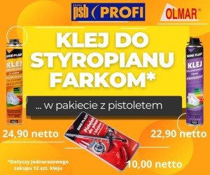 Chcielibyśmy poinformować Was o naszej najnowszej ofercie na klej do styropianu Farkom. Teraz w pakiecie 12 sztuk kleju do styropianu oferujemy również pistolet do kleju w jedynej cenie 10,00 zł netto. Klej do XPS w kolorze żółtym oferujemy w cenie 24,90 zł netto oraz klej w kolorze fioletowym w cenie 22,90 zł netto.