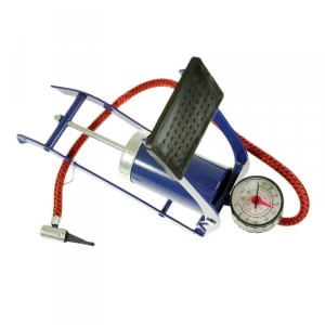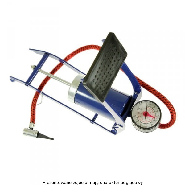 Pompka nożna 1-tłokowa, 100PSI. Manometr z odczytem do 7 BAR. W zestawie z pompką znajdują się adaptery – dzięki czemu służy nie tylko do pompowanie kół samochodowych ale także rowerowych, materacy, piłek, pontonów, itp.