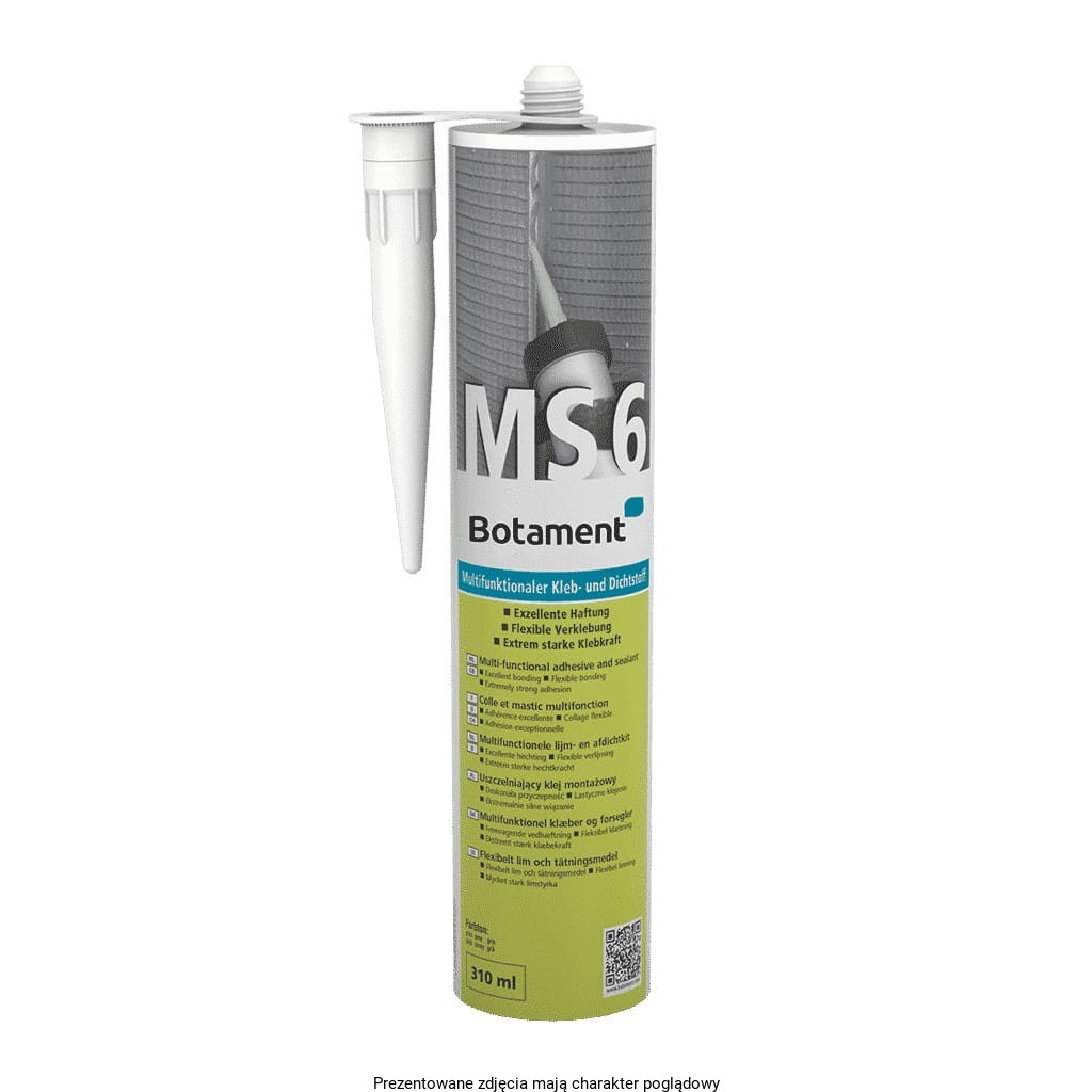 Botament MS6 to wszechstronny klej montażowy o wielofunkcyjnym zastosowaniu, charakteryzujący się elastycznością i doskonałą przyczepnością. Opracowany specjalnie do klejenia i uszczelniania płyt budowlanych Botament BP, produkt ten nadaje się również do zastosowania z różnorodnymi metalami, tworzywami sztucznymi oraz mineralnymi materiałami budowlanymi.