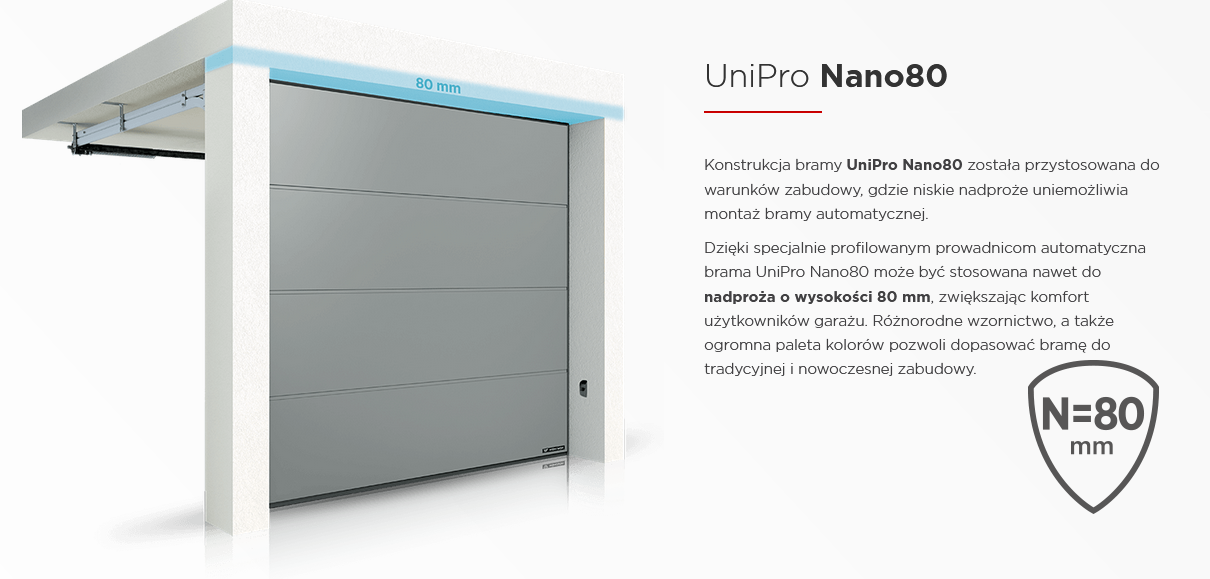 Konstrukcja bramy UniPro Nano80 to odpowiedź na potrzeby zabudowy, gdzie niskie nadproże wyklucza montaż bramy automatycznej. Dzięki specjalnym prowadnicom, brama UniPro Nano80 może być stosowana nawet do nadproża o wysokości 80 mm, zapewniając wygodę użytkownikom garażu. Różnorodność wzornictwa i szeroka paleta kolorów pozwolą Ci dopasować bramę do każdej zabudowy.
