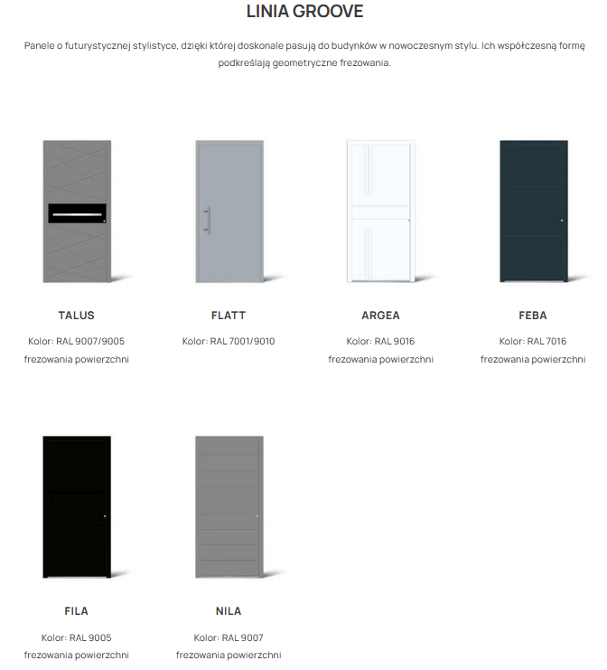 Linia GROOVE Drzwi z futurystycznym designem, idealne do nowoczesnych budynków. Geometryczne frezowania nadają im współczesny wygląd.