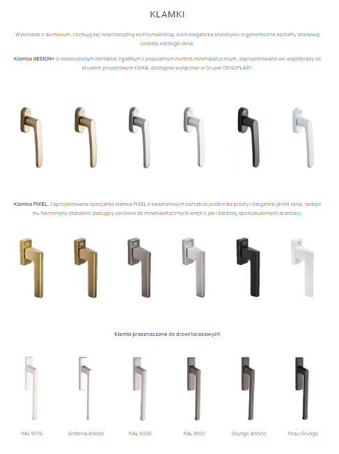 Klamka dESIGN+: Klamka o nowoczesnym kształcie, zgodnym z popularnym nurtem minimalistycznym. Zaprojektowana we współpracy ze studiem projektowym KISKA, jest dostępna wyłącznie w Grupie OKNOPLAST. Ta klamka dodaje nowoczesności i elegancji oknom.