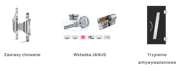 Wkładka JANUS to element zapewniający maksymalne bezpieczeństwo i ochronę drzwi. Wyposażona w wielopłaszczyznowe zapadki oraz zabezpieczenia antyrozwierceniowe i przeciw kopiowaniu klucza, stanowi najwyższej klasy barierę przed próbami nieautoryzowanego otwarcia drzwi. Symetryczny klucz eliminuje potrzebę zwracania uwagi na to, w jakiej pozycji wprowadzamy go do zamka. Wkładka jest obustronna, co umożliwia otwarcie drzwi niezależnie od tego, czy klucz pozostaje w zamku z drugiej strony. Opcjonalnie istnieje możliwość ujednolicenia wkładek – zamawiając kilka drzwi, użytkownik otrzymuje ten sam klucz do wszystkich, co zwiększa wygodę i funkcjonalność.