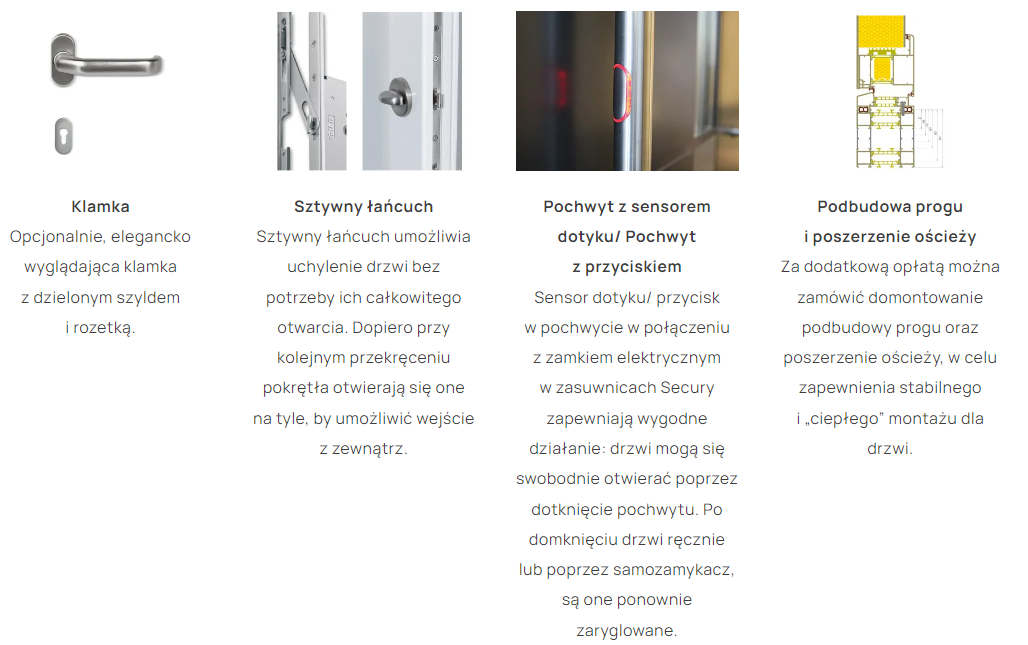 Pochwyt wyposażony w sensor dotyku lub przycisk w połączeniu z zamkiem elektrycznym w zasuwnicach Secury zapewniają wygodę w użytkowaniu. Dzięki temu rozwiązaniu, drzwi mogą być swobodnie otwierane poprzez delikatne dotknięcie pochwytu lub naciśnięcie przycisku. Po ręcznym zamknięciu drzwi lub wykorzystaniu samozamykacza, drzwi są znowu zabezpieczone i zaryglowane.